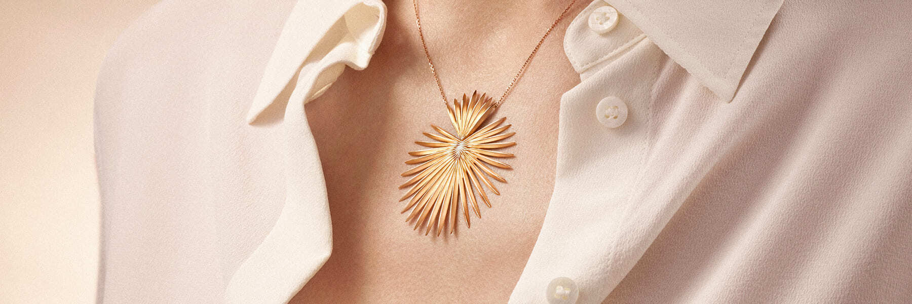The stylised Palma earrings play with the light and texture of gold, with their crisp, fan-shaped lines exuding intense, sun-drenched energy.